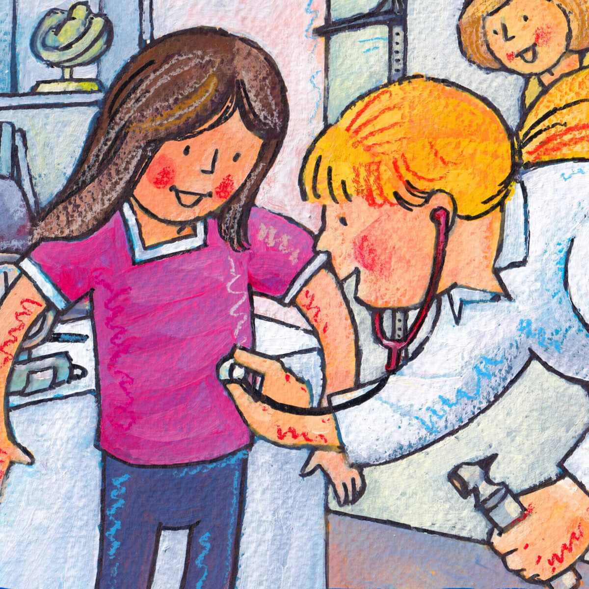 Lynn gaat naar de dokter/het ziekenhuis — ze speelt in de wachtkamer, ziet een dokter in een witte jas en ze doet haar mond open als de dokter er in wil kijken.