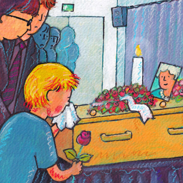 Oma is dood gegaan — bij het afscheid zijn er mooie bloemen, er brandt een kaarsje en er praat iemand door de microfoon.